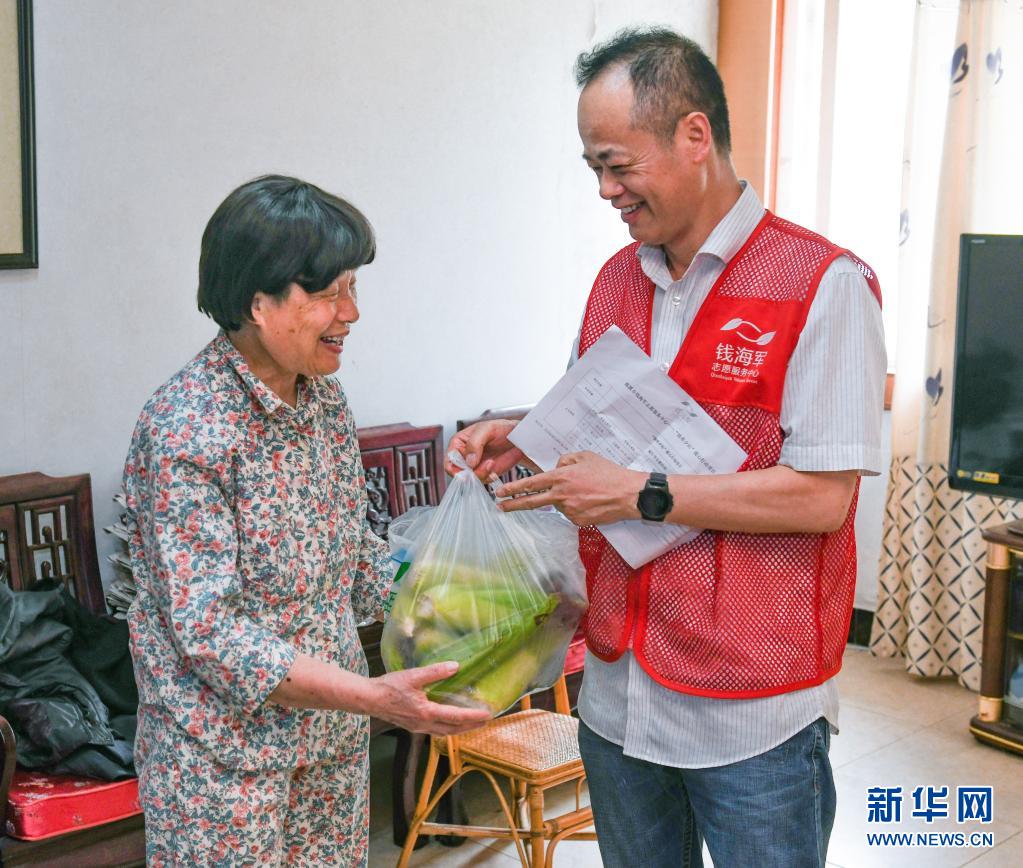 6月9日,志愿者给结对的79岁的邵彩雅老人(左)送上端午节的玉米、粽子和香囊,共迎端午。