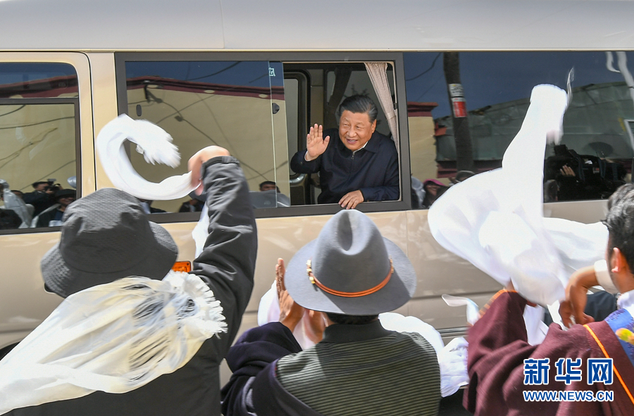 6月7日至9日,中共中央总书记、国家主席、中央军委主席习近平在青海考察。这是8日下午,习近平在海北藏族自治州刚察县沙柳河镇果洛藏贡麻村考察时,向村民们挥手致意。新华社记者 谢环驰 摄