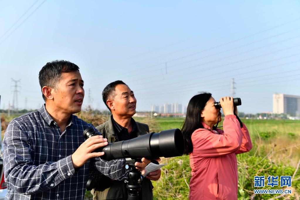 在东营市图书馆附近,东营市观鸟协会会长郭建三(左)和同事在观测东方白鹳(5月12日摄)。新华社记者 郭绪雷摄
