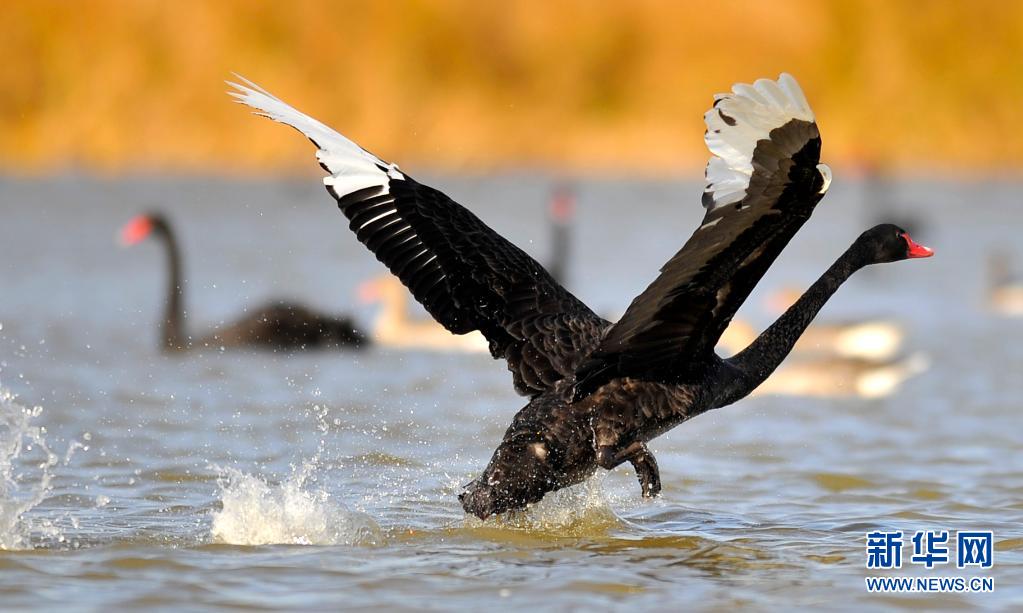 在山东黄河三角洲国家级自然保护区拍摄的黑天鹅(2012年10月31日摄)。新华社记者 郭绪雷摄