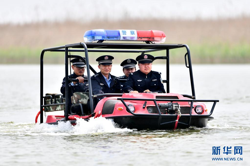 在山东黄河三角洲国家级自然保护区,杨华章(前排左)乘坐水陆两栖巡逻车和同事们巡查(5月13日摄)。新华社记者 郭绪雷摄