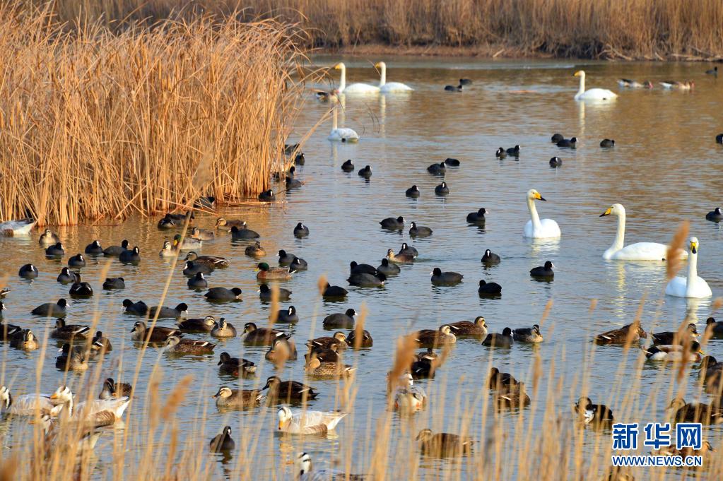 白天鹅等候鸟在山东黄河三角洲国家级自然保护区里栖息(2014年12月22日摄)。新华社记者 郭绪雷摄