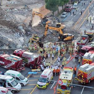 6月9日,救援人员在韩国光州建筑倒塌现场工作。