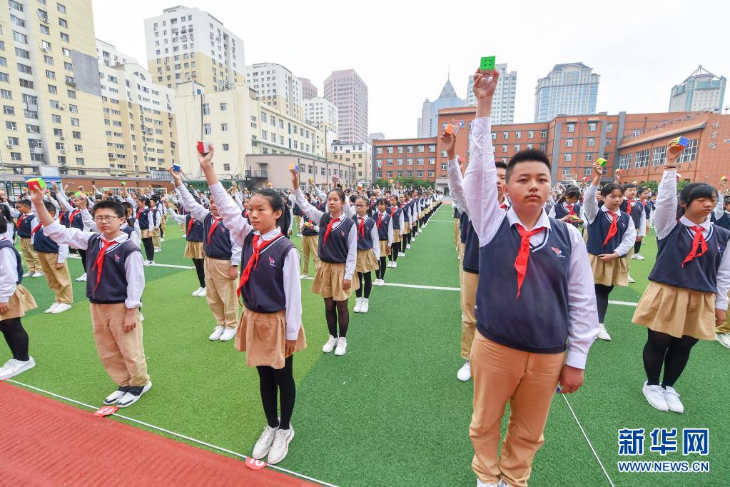 6月10日,在北安小学操场,成功还原魔方的学生高举魔方。