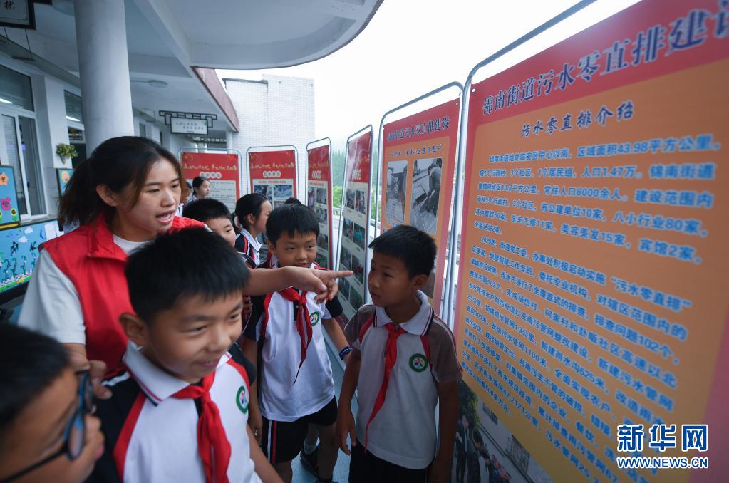 6月10日,在杭州市临安区锦南街道的锦南小学,学生在志愿者的解说下参观五水共治和当地污水零直排区建设工作展板。