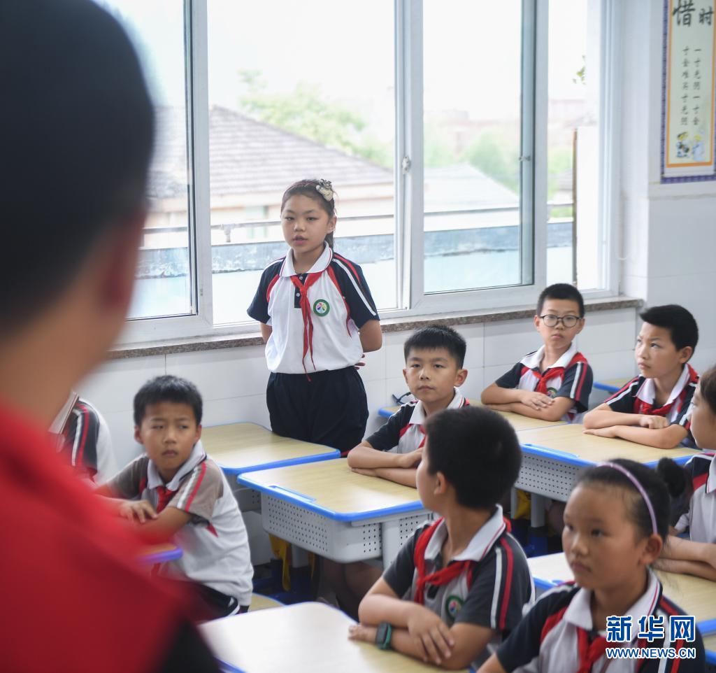 6月10日,在杭州市临安区锦南街道的锦南小学教室内,学生在回答关于“五水共治”的提问。