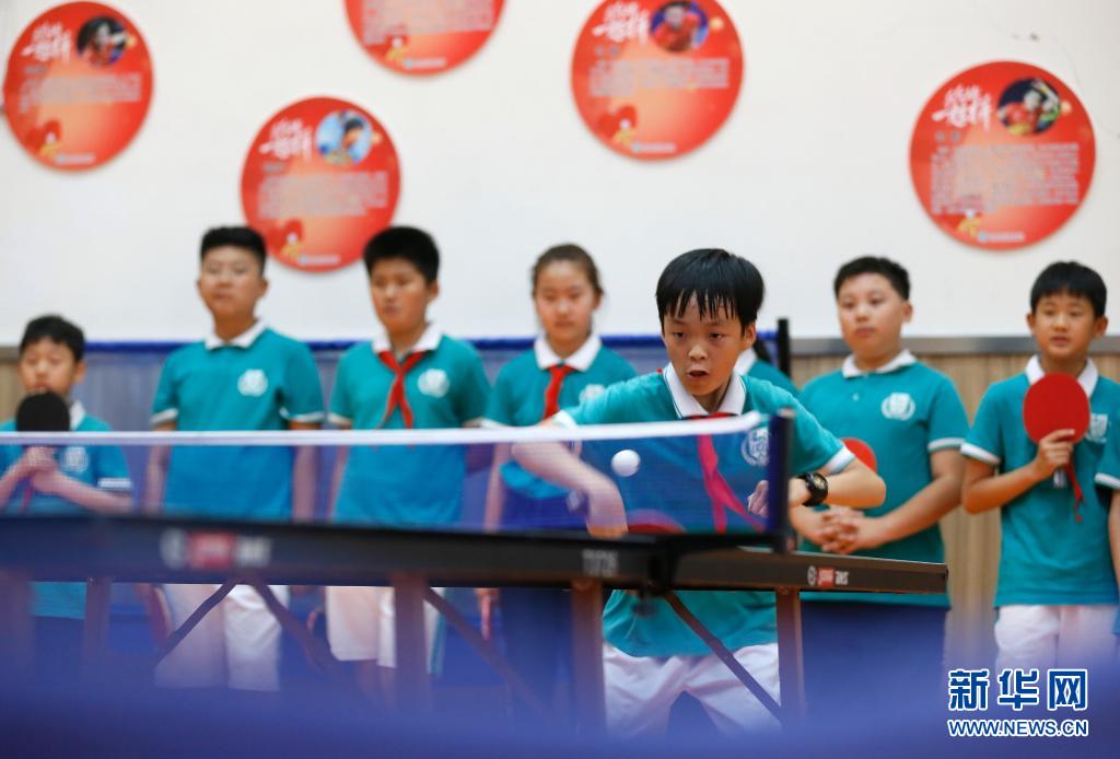 6月10日,山东省青岛通济实验学校的学生在大课间进行乒乓球比赛。