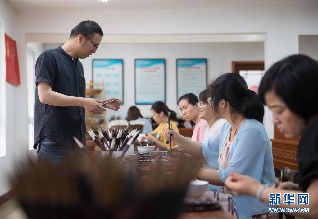 6月10日,在位于湖州爱山街道的王一品斋笔庄制笔车间,王一品斋笔庄第17代传承人许剑锋(左一)跟制笔师交流。