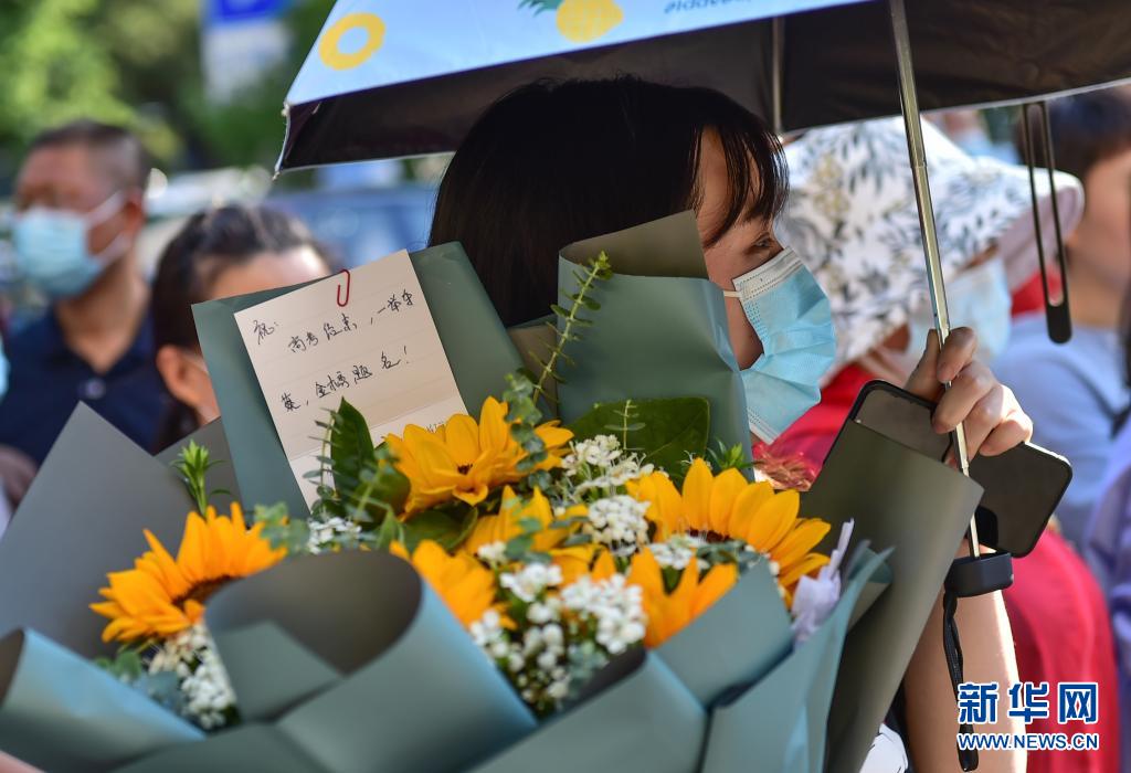 6月10日,家长手持鲜花在北京市回民学校考点外等候考生。