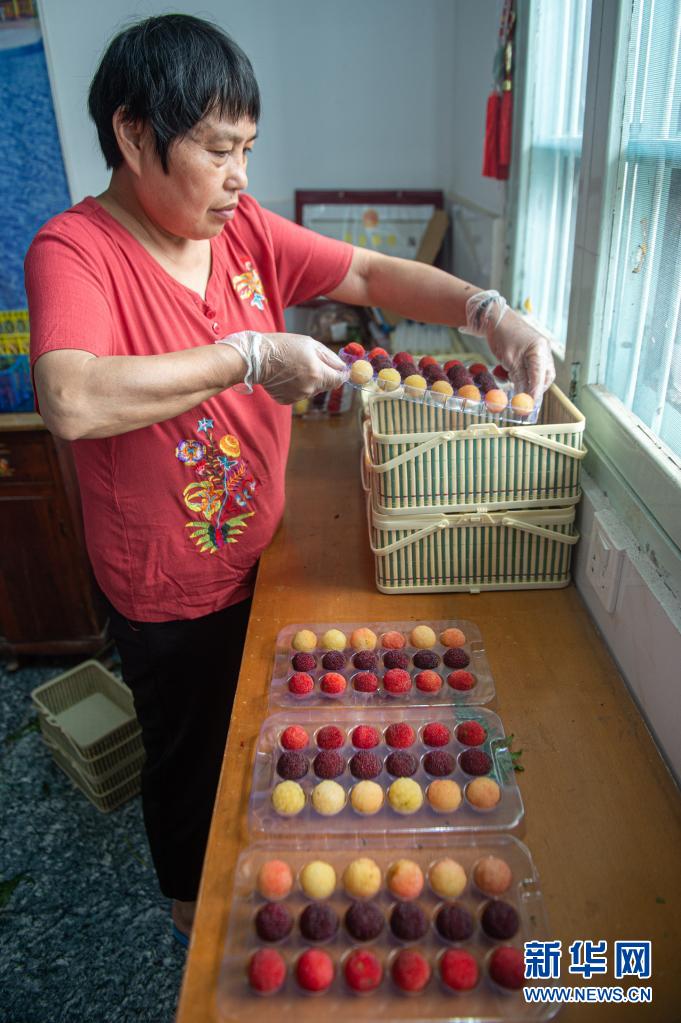 6月10日,慈溪市横河镇农民高华芬在家中将挑选好的杨梅整理装箱,准备出售。