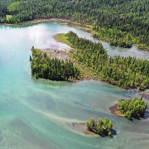 6月10日拍摄的新疆阿勒泰地区喀纳斯景区卧龙湾景色(无人机照片)。