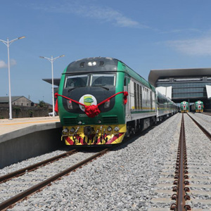 6月10日,尼日利亚总统布哈里(前排左三)在拉各斯的莫博拉吉·约翰逊火车站出席拉伊铁路通车仪式并揭牌。新华社发(彼得·奥巴萨摄)