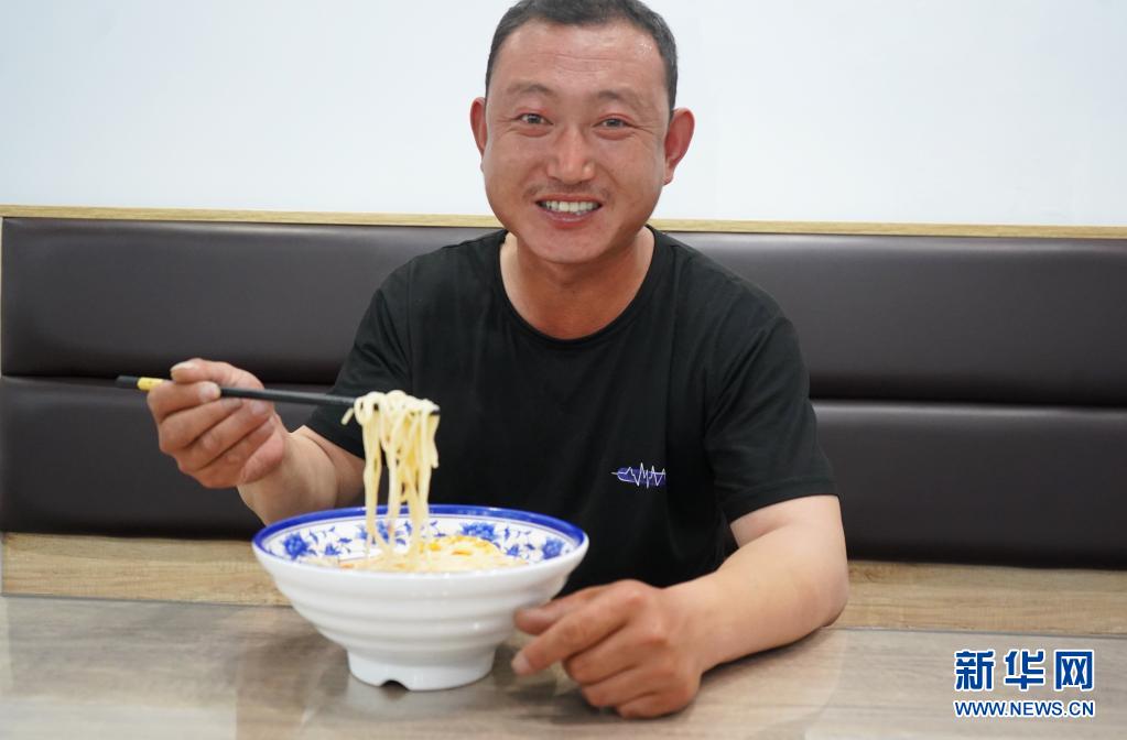 6月9日,在邢台沙河市金沙河集团,苏川在收割工作结束后吃面。新华社记者 金皓原 摄
