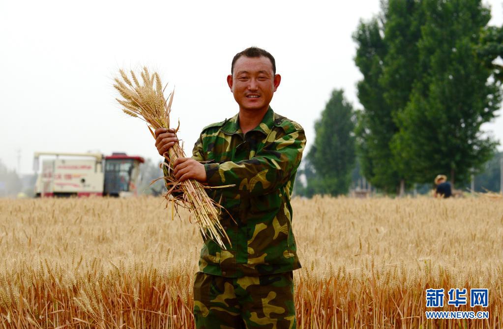 6月8日,在邢台市南和区的农作物种植基地,苏川手捧刚收割的小麦。新华社记者 金皓原 摄