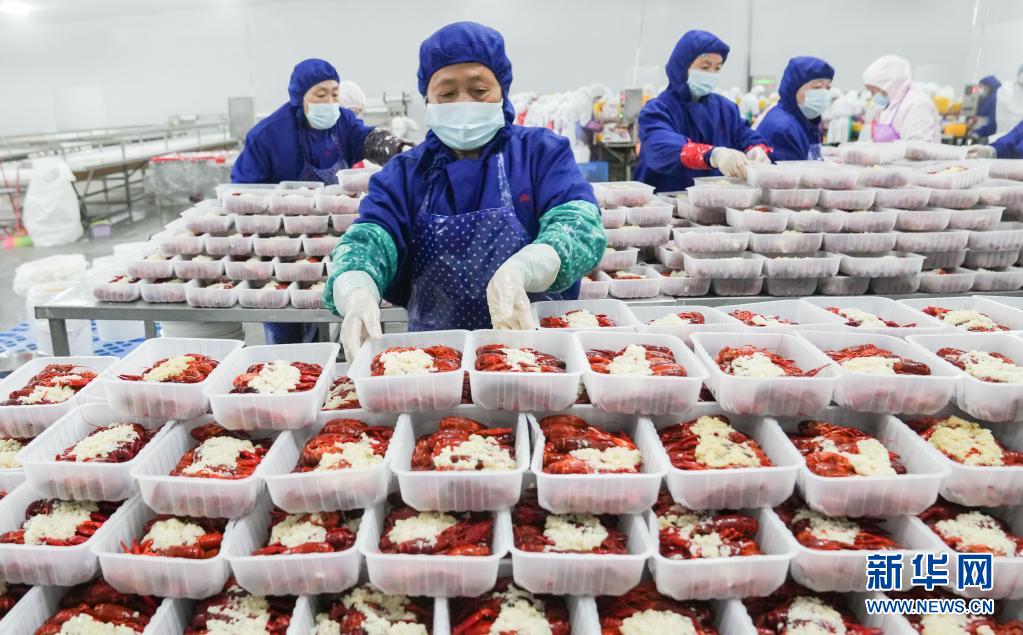 湖北潜江华山科技股份有限公司的工人们加工小龙虾(6月9日摄)。