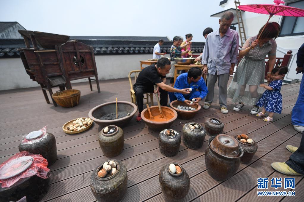 6月11日,塘栖镇丁山河村的村民们在老字号老刀糕点铺的院子里用传统古法腌制“灰鸭蛋”。