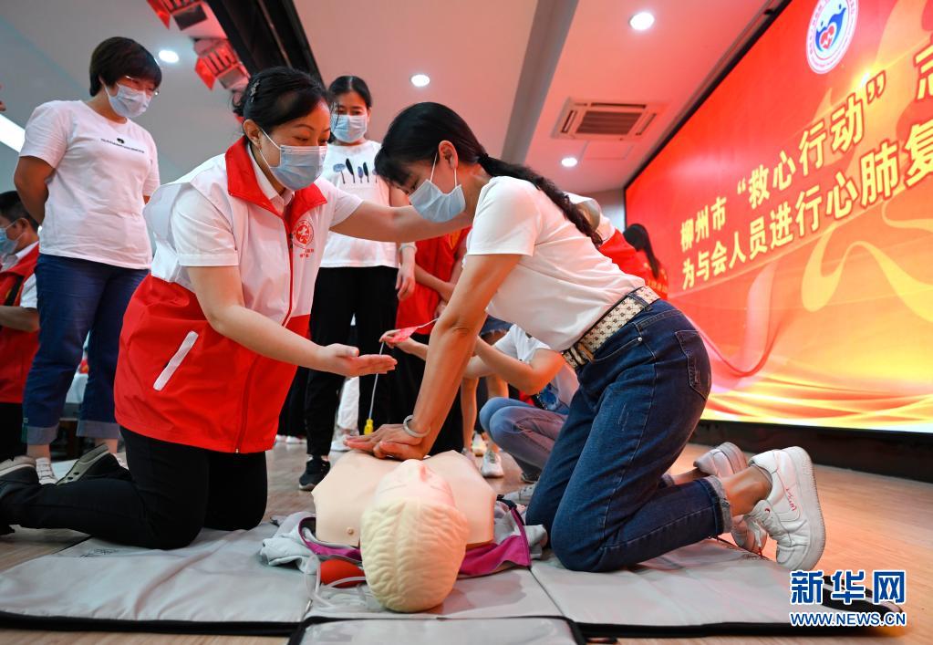 6月11日,在广西柳州市人民医院,志愿者参加心肺复苏及AED(自动体外除颤器)使用培训。