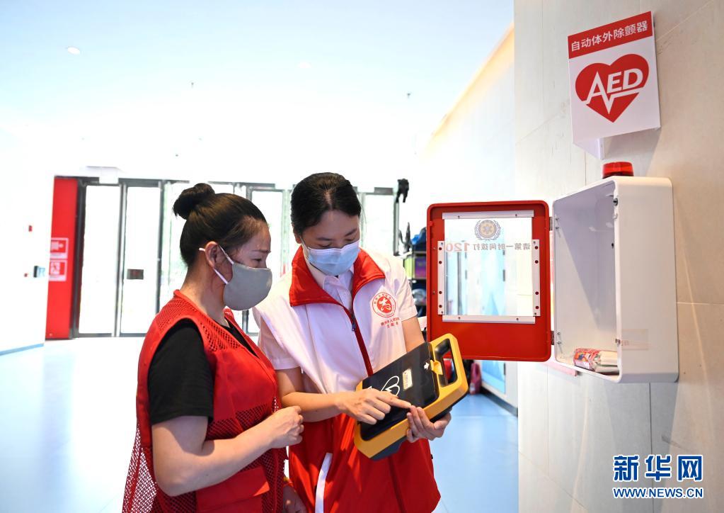 6月11日,在广西柳州市康顺路一家大型商场,志愿者向市民普及AED(自动体外除颤器)使用技能。
