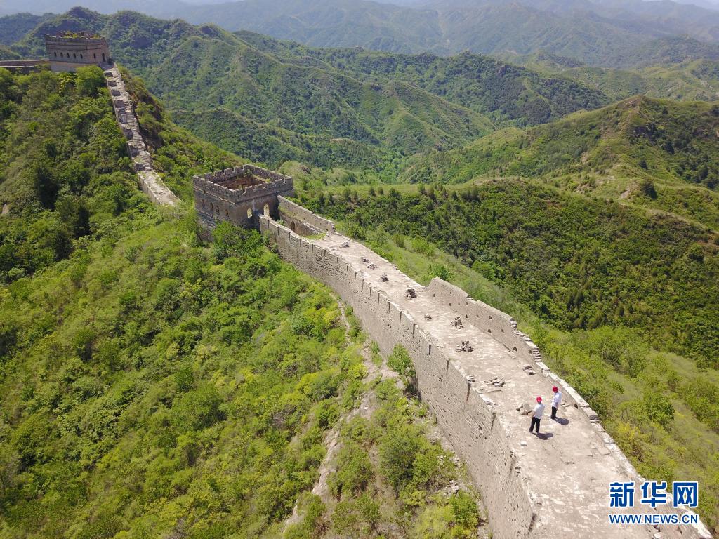 6月11日,在金山岭长城,技术人员在采集长城破损情况信息(无人机照片)。