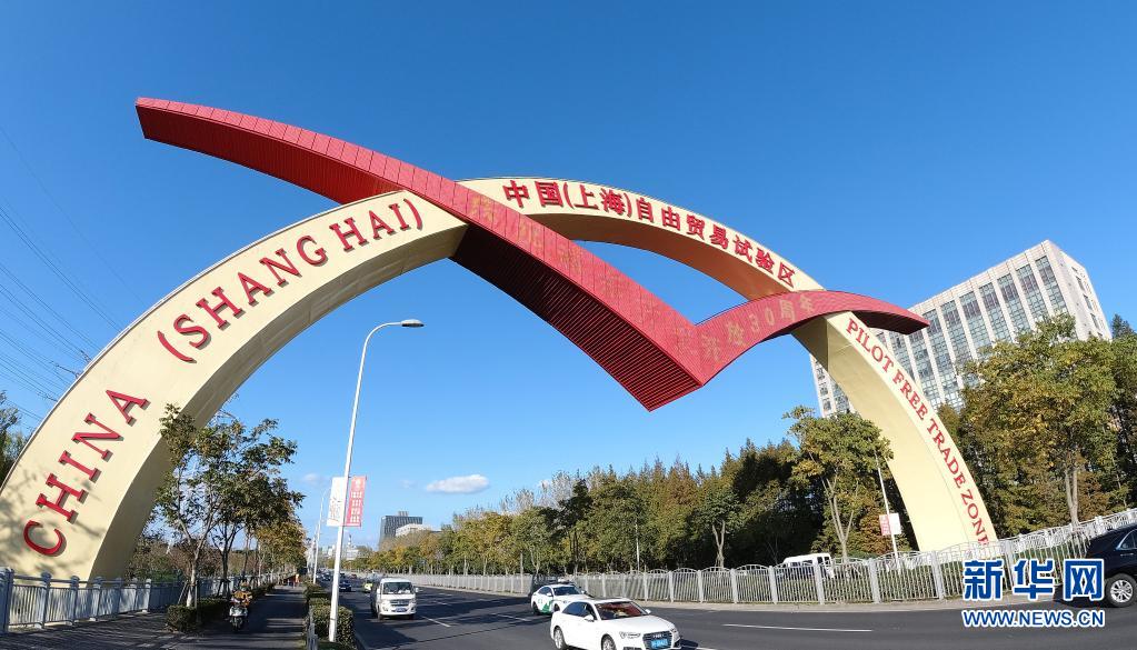 这是2020年11月11日拍摄的中国(上海)自由贸易试验区标志门。新华社记者 方喆 摄