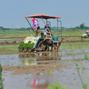 6月11日,农民在青岛市城阳区上马街道的盐碱地稻作改良示范基地驾驶插秧机进行插秧作业。