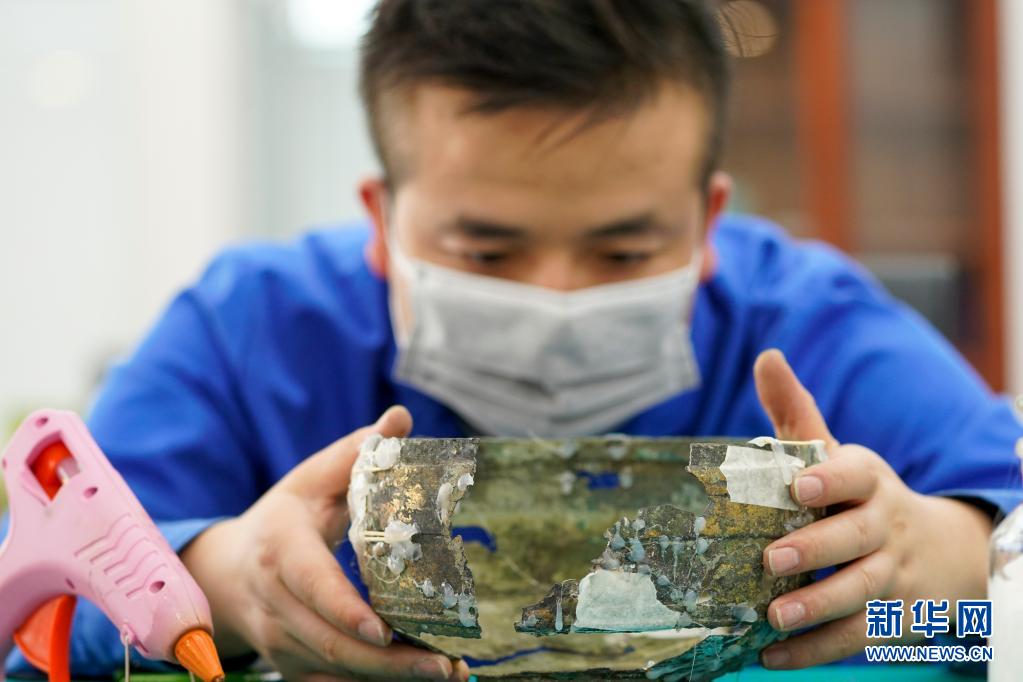 6月9日,在三峡文物科技保护基地的文物修复室内,文物修复师赵晓宇在修复一件汉代的青铜器。