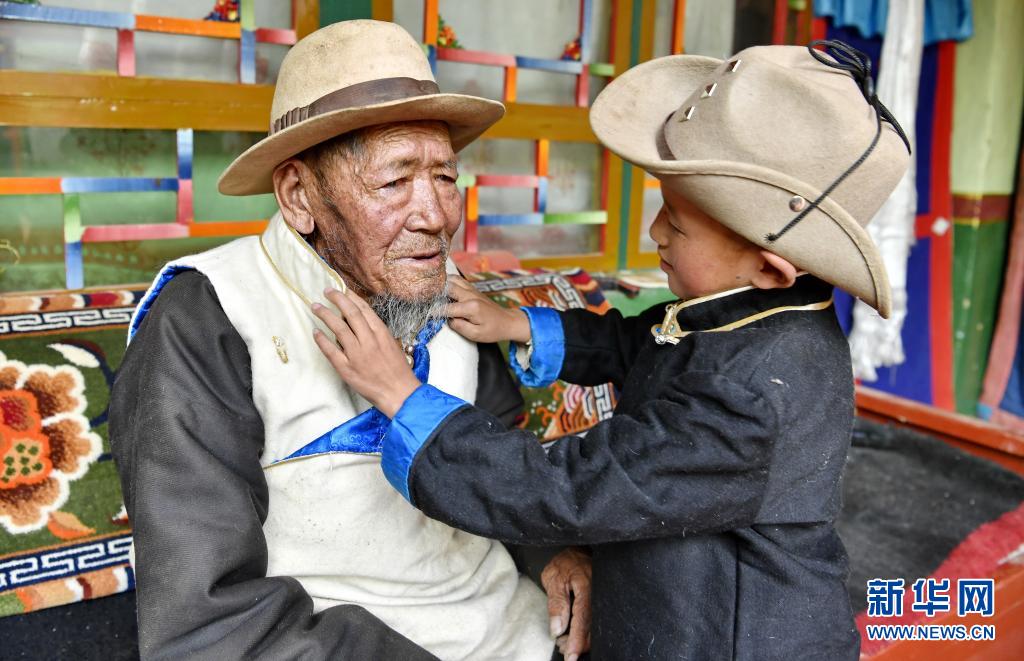 索朗的外孙旦增晋美帮他整理新衣服(4月16日摄)。新华社记者 张汝锋 摄