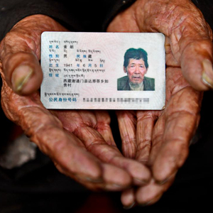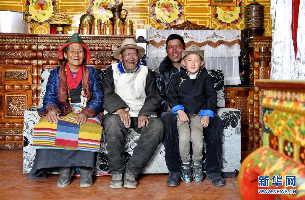 索朗(左二)与老伴穷阿(左一)、儿子格桑旺堆(右二)和外孙旦增晋美在家中合影(4月16日摄)。新华社记者 张汝锋 摄
