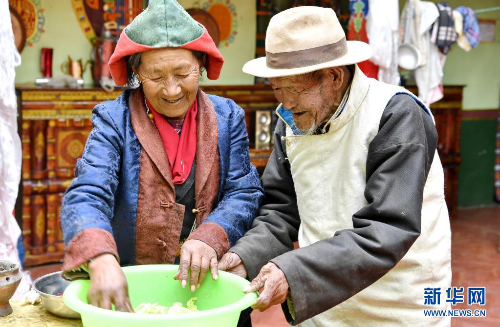 索朗(右)和老伴穷阿洗菜(4月16日摄)。新华社记者 张汝锋 摄