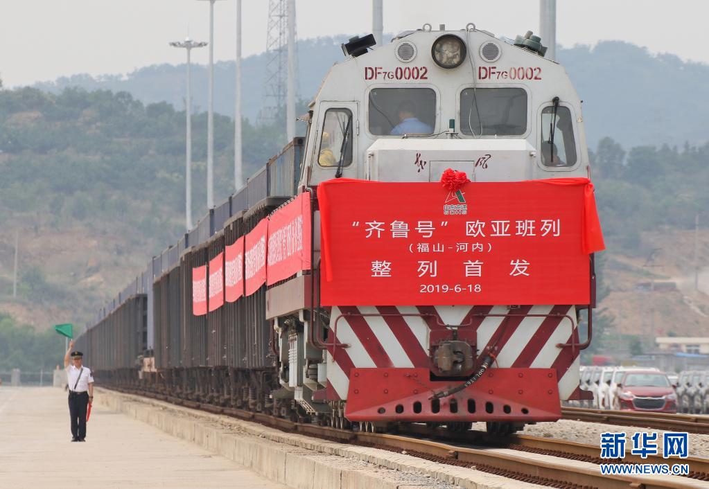2019年6月18日,“齐鲁号”欧亚班列(福山-河内)从济铁烟台物流园发车。当日,“齐鲁号”欧亚班列(福山-河内)从位于山东省烟台市福山区的山东济铁烟台物流园驶出,驶向终点站越南河内。新华社发(唐克 摄)