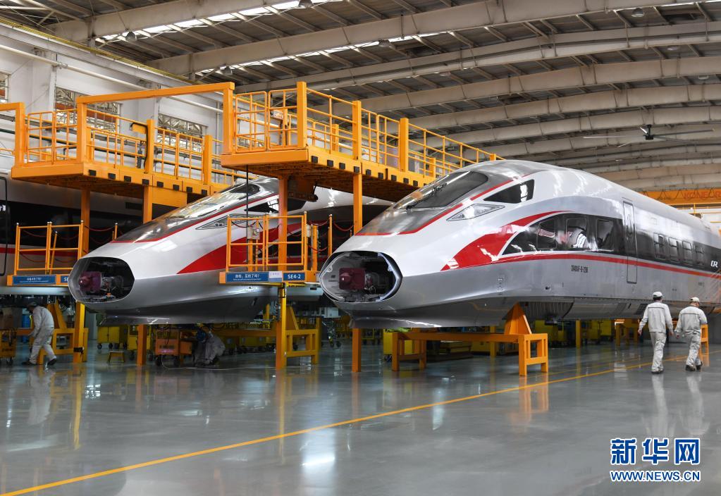 工人在中车青岛四方机车车辆股份有限公司“复兴号”动车组生产线上忙碌(2020年3月25日摄)。新华社记者 李紫恒 摄