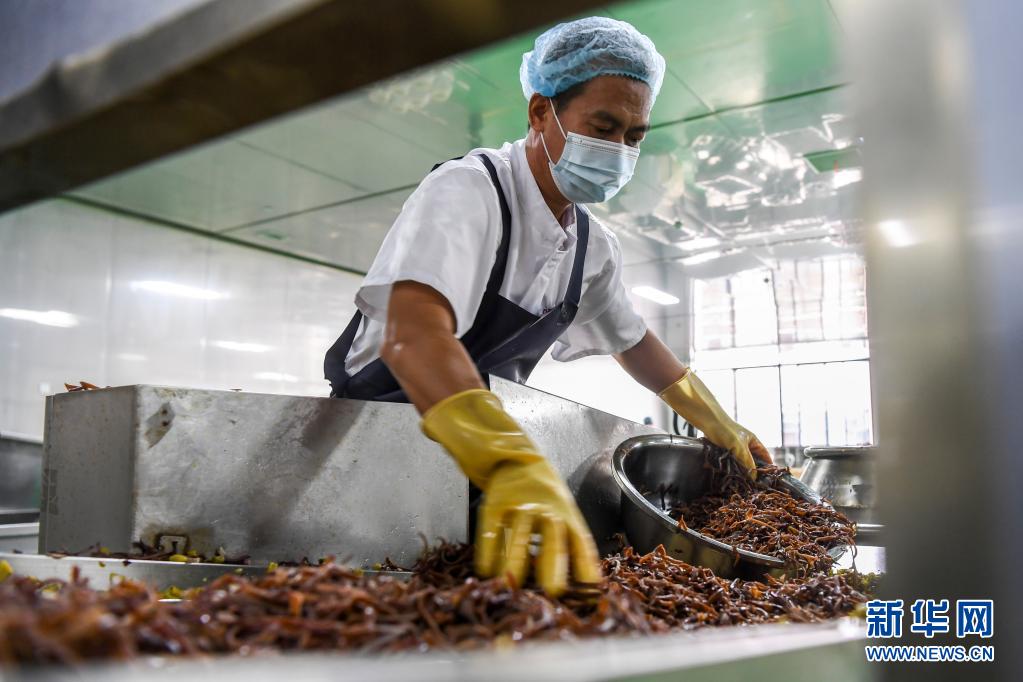 6月11日,广西柳州市一家螺蛳粉生产企业的工作人员将螺蛳粉配料送上生产线。
