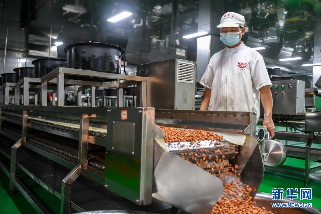 6月11日,广西柳州市一家螺蛳粉生产企业的工作人员观察生产线的运行状况。