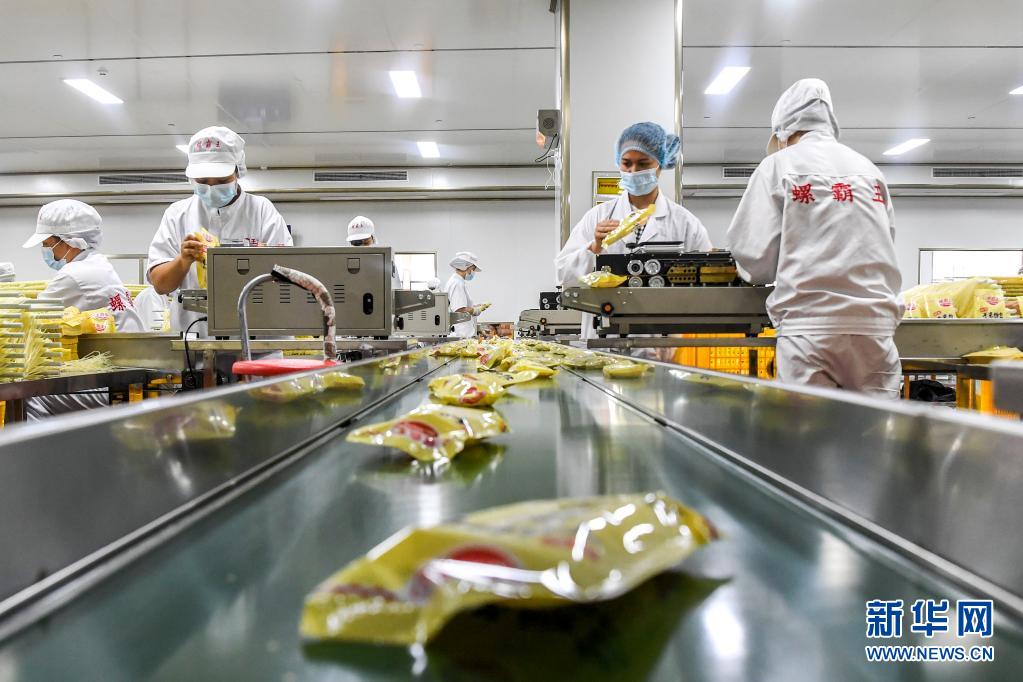 6月11日,广西柳州市一家螺蛳粉生产企业的工作人员在封装米粉。
