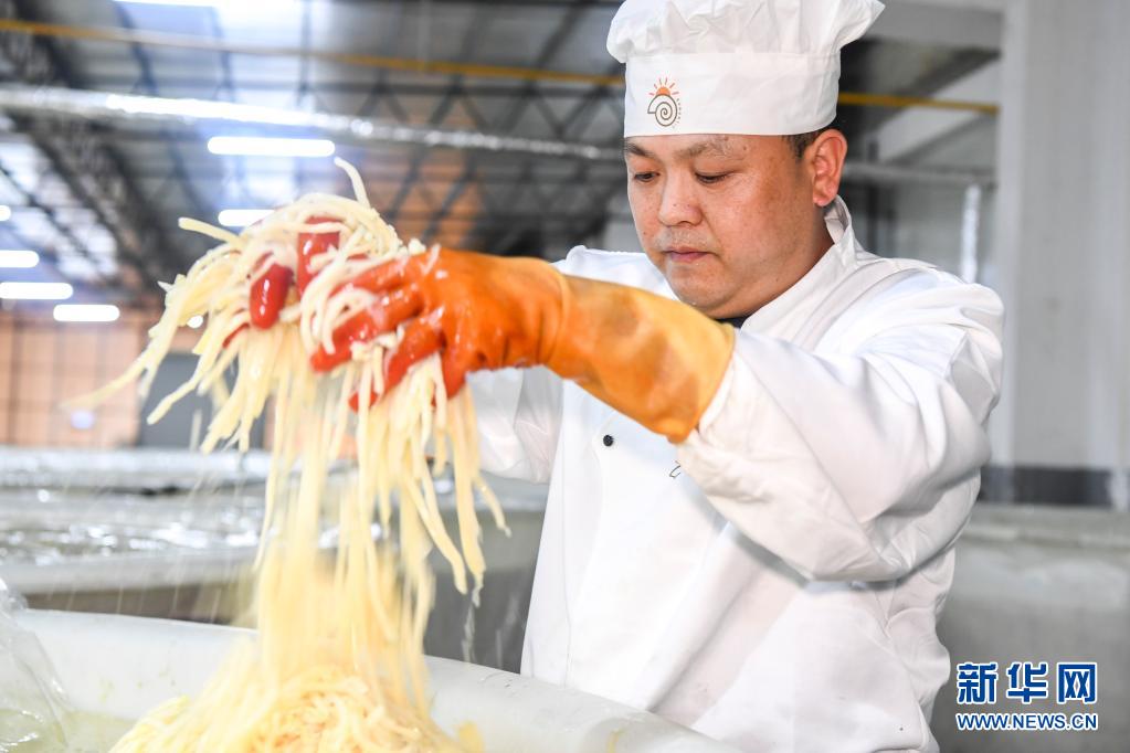 6月11日,在广西柳州市一家螺蛳粉生产企业,“闻臭师”李永国查看酸笋腌制情况。