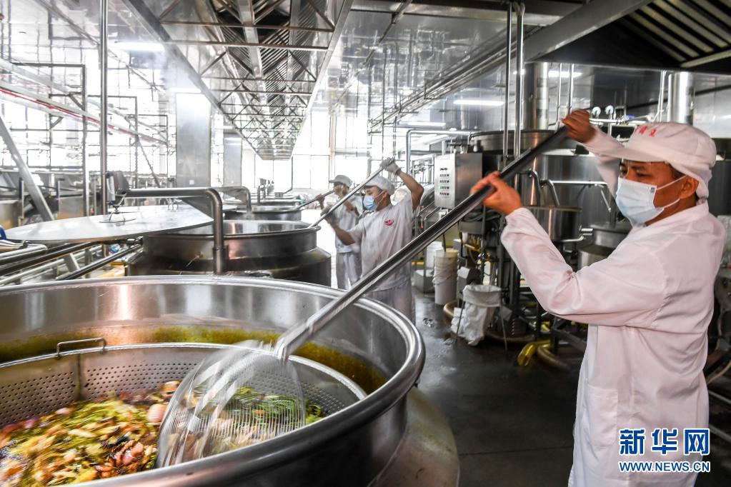 6月11日,广西柳州市一家螺蛳粉生产企业的工作人员在熬制香油。