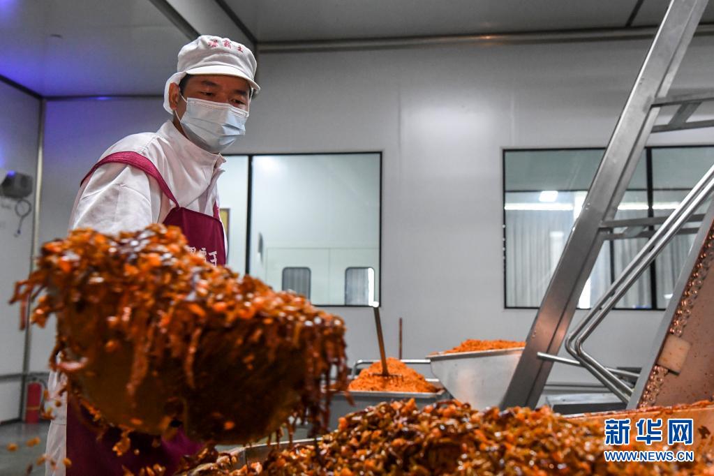 6月11日,广西柳州市一家螺蛳粉生产企业的工作人员为袋装螺蛳粉生产线补充配料。