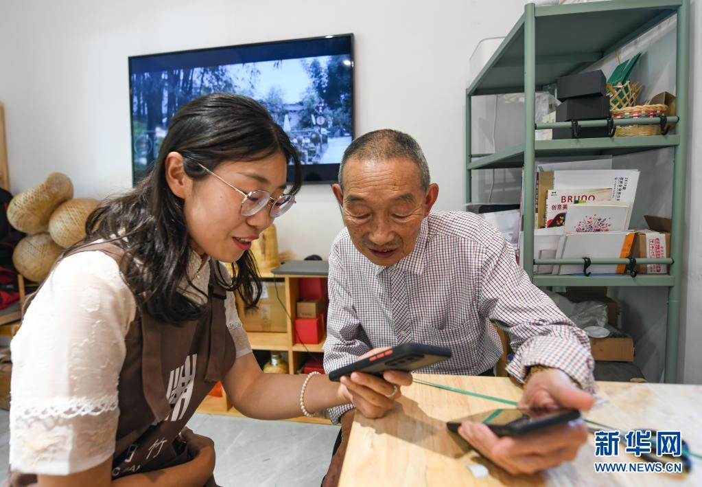 在四川省崇州市道明镇竹艺村,赵思进(左)和徒弟肖瑶讨论竹编编法(6月1日摄)。新华社记者 王曦 摄