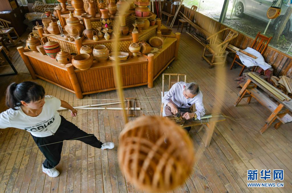 在四川省崇州市道明镇竹艺村,赵思进(右)将竹料匀丝(6月1日摄)。新华社记者 王曦 摄