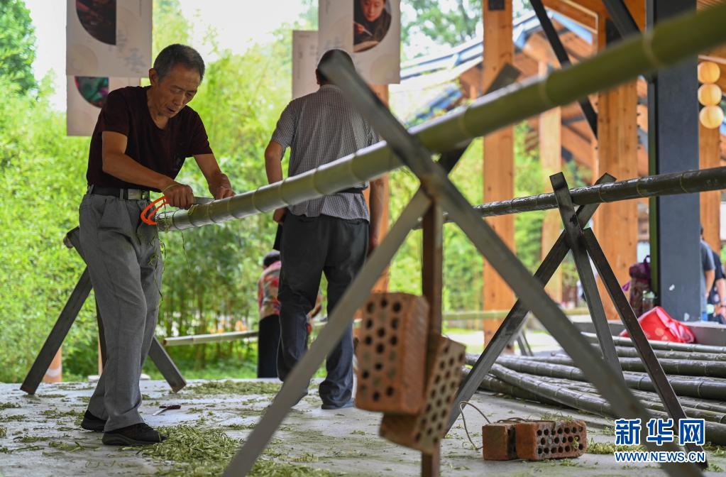 在四川省崇州市道明镇竹艺村,工人在刮青(6月1日)。新华社记者 胥冰洁 摄