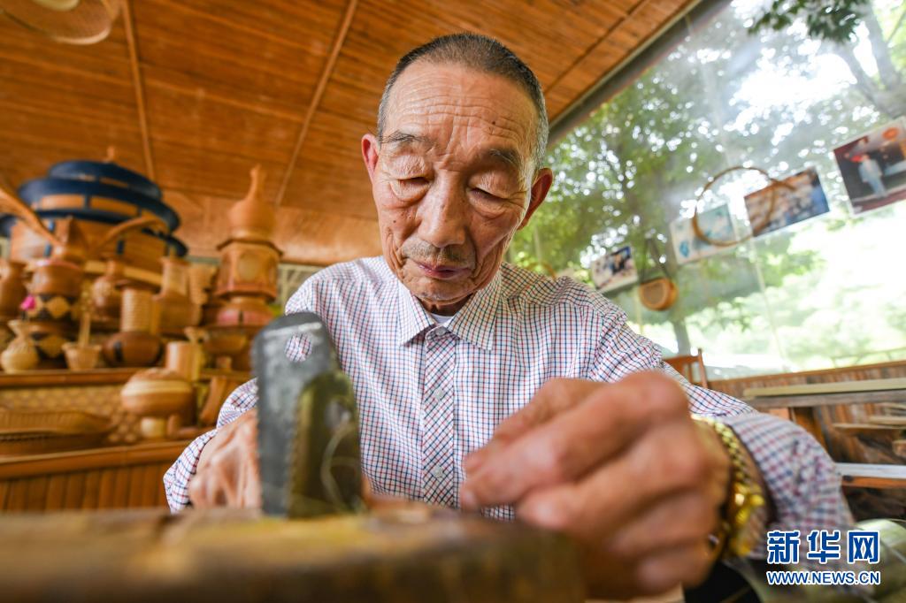 在四川省崇州市道明镇竹艺村,赵思进将竹料匀丝(6月1日摄)。新华社记者 王曦 摄