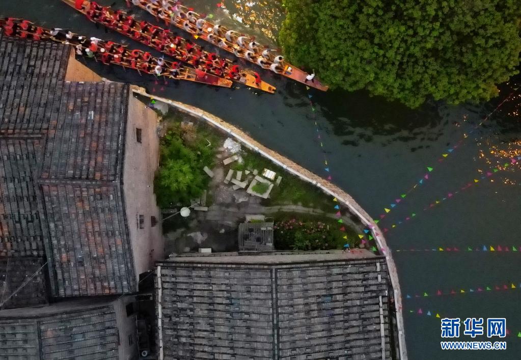 龙舟驶过三溪村成片古宅(无人机照片,6月11日摄)。