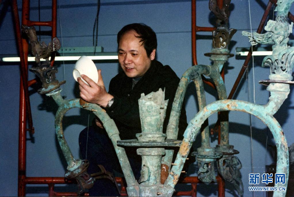 文物修复师杨晓邬在修复1号青铜神树(资料照片)。