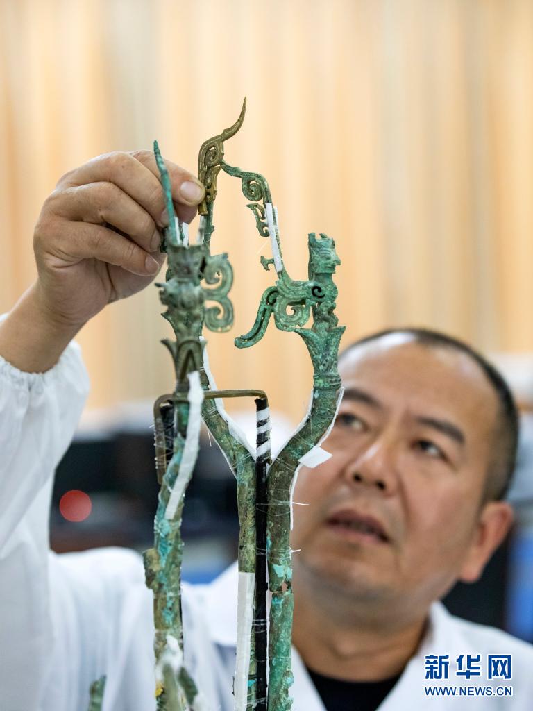 6月11日,在位于四川德阳广汉市的三星堆博物馆文保中心,文物修复师郭汉中根据3号青铜神树的人首鸟身像尾部破损缺口信息来确定应该用哪个再造的铜尾巴进行修复。