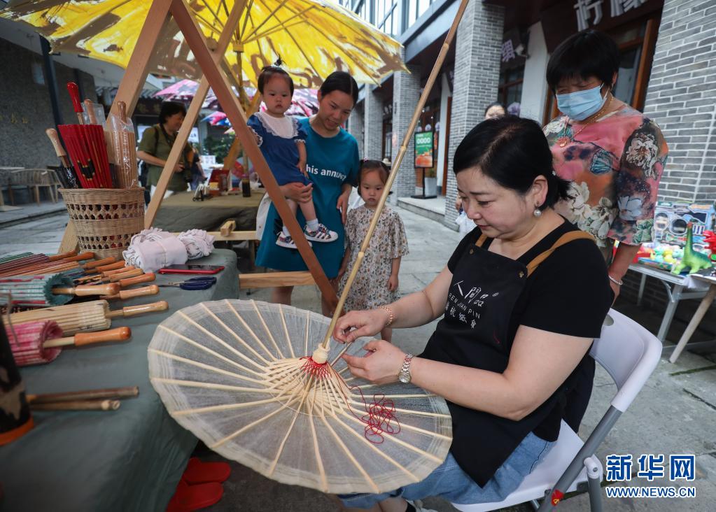 6月12日,手工艺人在瓶窑老街非遗集市上展示油纸伞制作技艺。