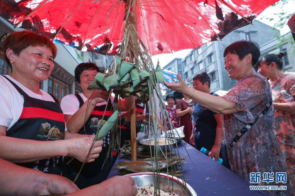 6月12日,游客在瓶窑老街非遗集市上观看传统粽子制作。