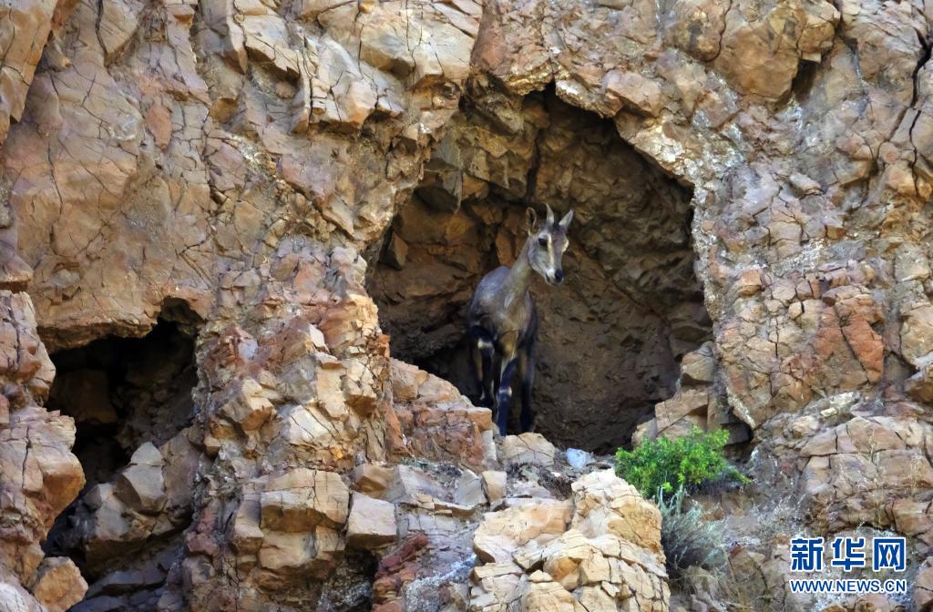内蒙古乌海市甘德尔山中,一只岩羊在悬崖上的山洞里(6月8日摄)。新华社记者 贾立君 摄