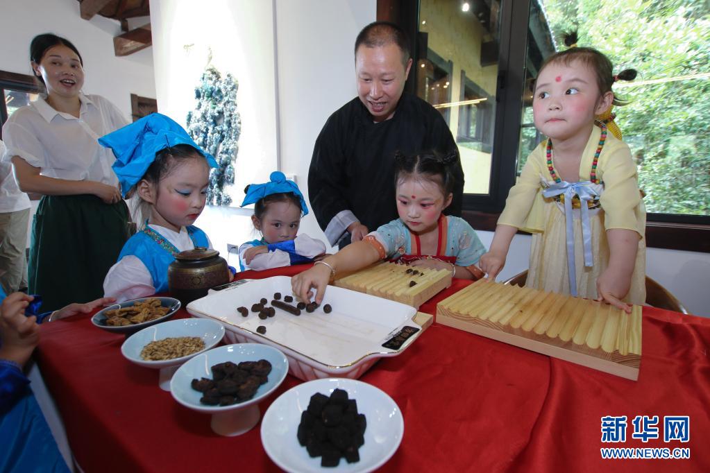 6月12日,胥口镇中心幼儿园的小朋友在工作人员指导下体验中药药丸的制作。
