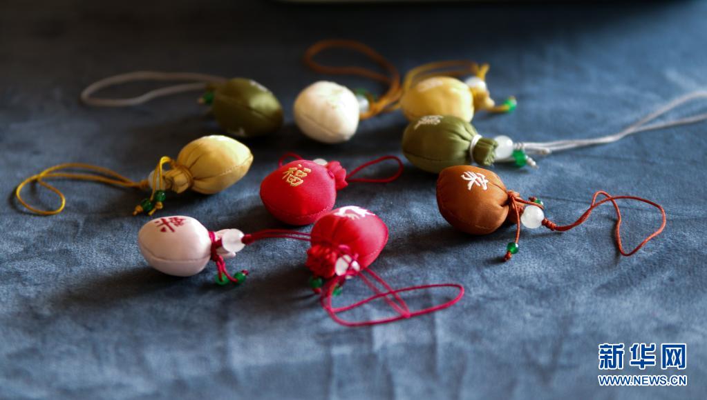 这是在药谷小镇中药香囊设计制作大赛现场拍摄的各类香囊(6月12日摄)。