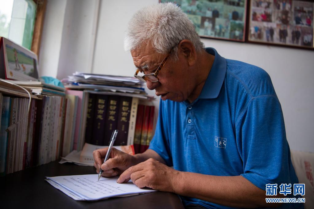 李逢华在浮山县东陈村的家里整理村史(6月8日摄)。新华社记者 杨晨光 摄